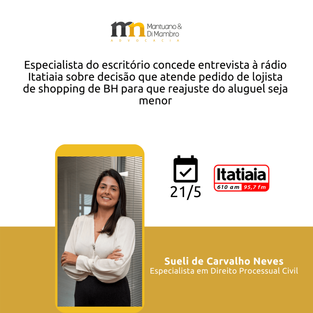 O nosso especialista em direito imobiliário, Marcelo Mantuano, concedeu importantes entrevistas no último mês à Rádio Inconfidência e à TV Alterosa. Em entrevista concedida ao Jornal Alterosa Alerta, Marcelo tirou dúvidas sobre Direito Imobiliário. Já para a Rádio Inconfidência, o sócio falou sobre a proibição de locações de curta temporada em condomínios residenciais. Confira as […]